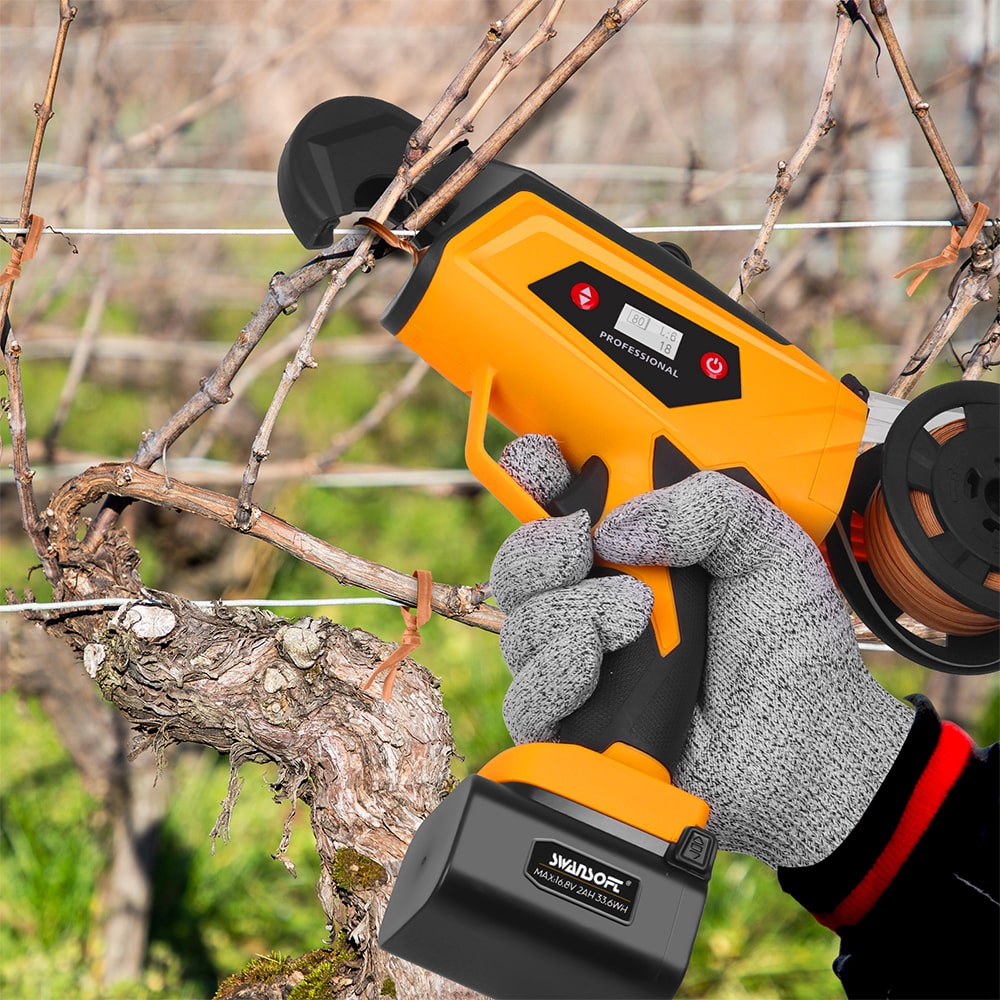 دستگاه گره زن شارژی SWANSOFT سوآن سافت مدل SW-B12 کار گره زدن را با استفاده از نیروی ذخیره شده در باتری لیتیوم آیونی انجام می دهد. از این دستگاه می توانید برای گره زدن شاخه های درخت مو به داربست در باغ های انگور و یا بستن شاخه های بارده درخت کیوی در باغات و یا گره زدن انواع مختلف محصولات در گلخانه ها استفاده نمود.