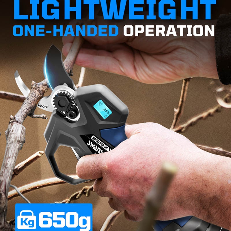 قیچی هرس شارژی جدید SWANSOFT سوآن سافت مدل PRU-30 از یک موتور (براشلس) بدون جاروبک قدرتمند 850 واتی قدرتمند بهره می برد که نیروی لازم را برای برش شاخه هایی تا قطر 30 میلی متر فراهم می کند. موتور الکتریکی به کار رفته در این قیچی شارژی از نوع بدون جاروبک (BRUSHLESS) می باشد که در استفاده از نیروی ذخیره شده در باتری بسیار بهینه عمل می کند و طول عمر بیشتری نسبت به موتورهای الکتریکی معمولی دارد.