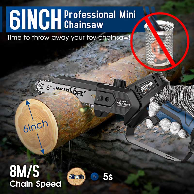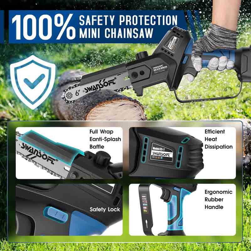 اره هرس شارژی جدید SWANSOFT سوآن سافت مدل CS-1 با ساطوری 150 میلی متری دارای حداکثر قطر برش 135 میلی متر می باشد. سرعت برش این اره زنجیری شارژی 8 متر بر ثانیه است که سرعت برش مناسبی محسوب می شود. زنجیر برش استفاده شده برای این اره کیفیت بسیار بالایی دارد. این اره دارای سیستم روغن کاری اتوماتیک است. برای روغن کاری زنجیر کافی است که قبل از شروع به کار مخزن روغن را از روغن مناسب پر کنید.