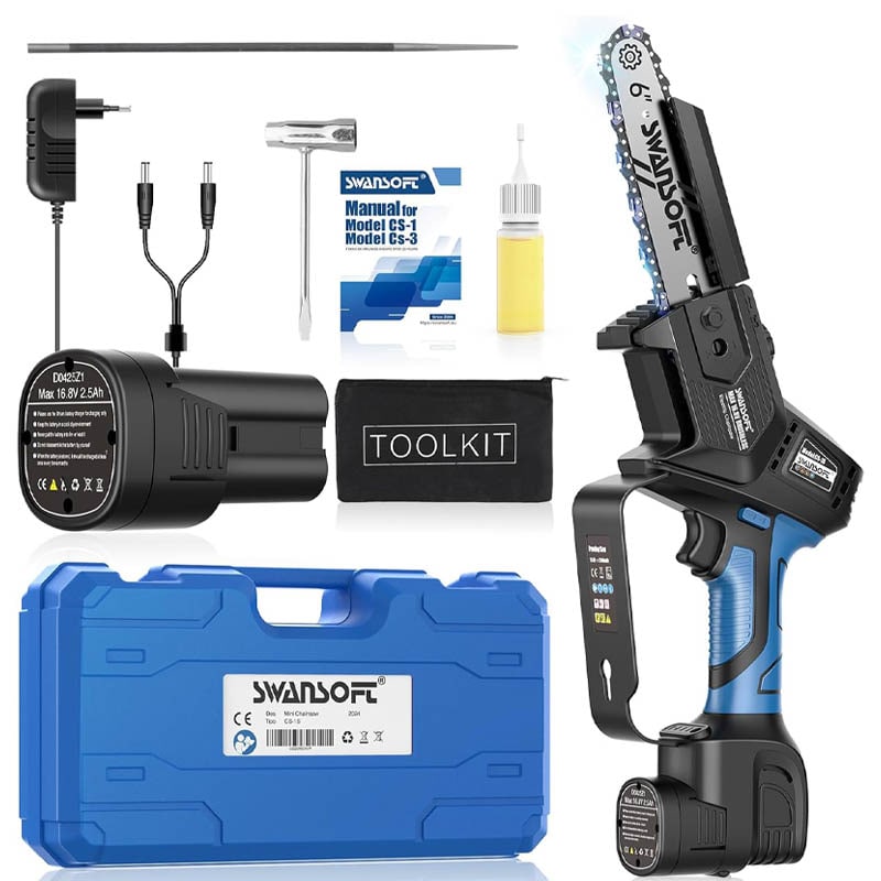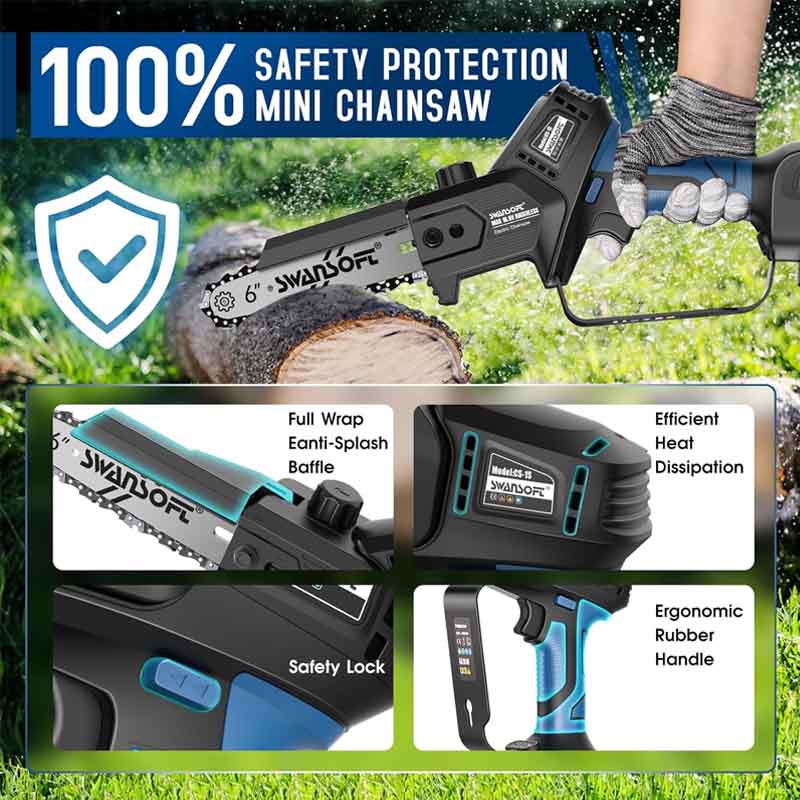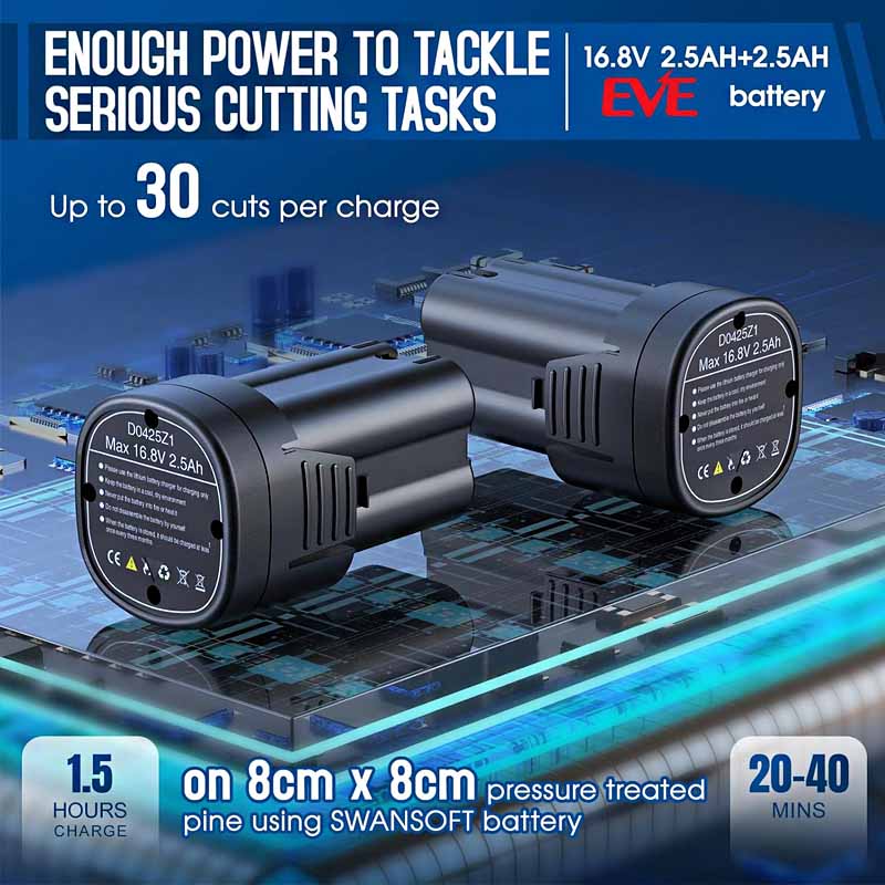وظیفه ذخیره سازی و تأمین انرژی لازم برای موتور اره هرس شارژی جدید SWANSOFT سوآن سافت مدل CS-1S بر عهده باتری های لیتیوم آیونی با ظریف بالاست. همراه این اره دو باتری به شما عرضه خواهد شد.