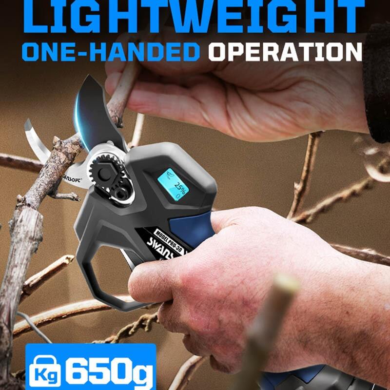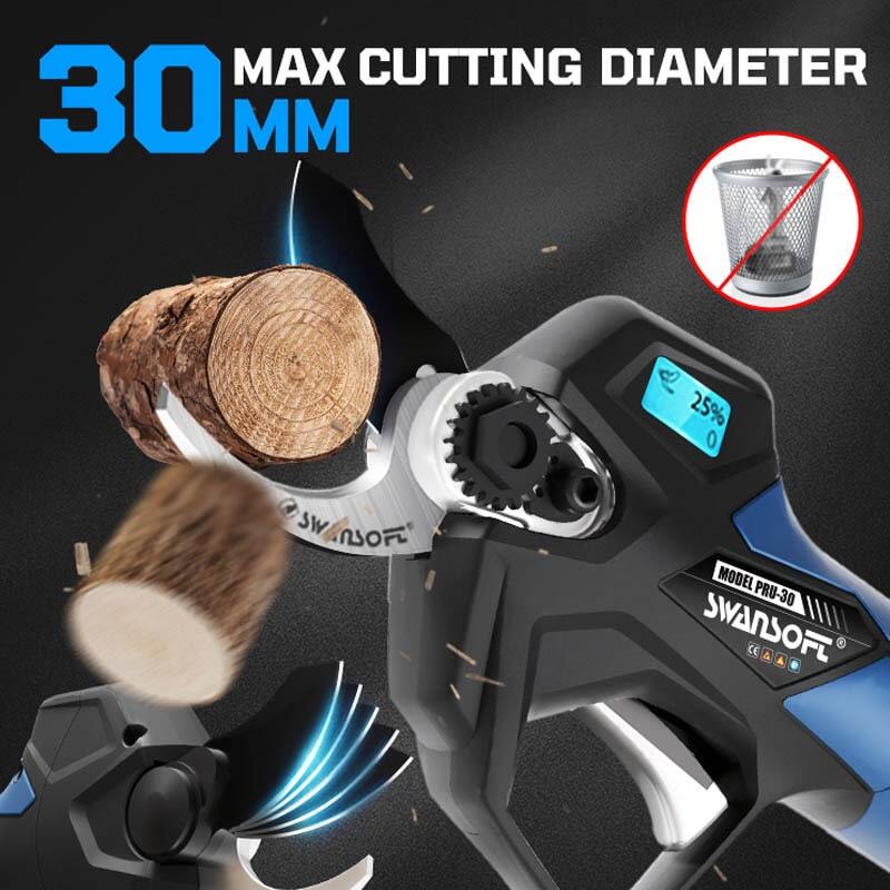 قیچی هرس شارژی جدید SWANSOFT سوآن سافت مدل PRU-30 از یک موتور (براشلس) بدون جاروبک قدرتمند 850 واتی قدرتمند بهره می برد که نیروی لازم را برای برش شاخه هایی تا قطر 30 میلی متر فراهم می کند. موتور الکتریکی به کار رفته در این قیچی شارژی از نوع بدون جاروبک (BRUSHLESS) می باشد که در استفاده از نیروی ذخیره شده در باتری بسیار بهینه عمل می کند و طول عمر بیشتری نسبت به موتورهای الکتریکی معمولی دارد.