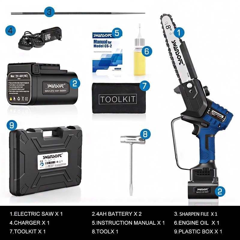 اره هرس شارژی جدید SWANSOFT سوآن سافت مدل CS-2 مناسب برای انواع مختلف هرس (از هرس سبک تا هرس سنگین) بوده و با طول ساطوری 200 میلی متر (8 اینچ) و قطر برش 190 میلی متر همراه با دو باتری عرضه می شود. وزن اره بدون باتری 1120 گرم می باشد و در ساخت آن از بهترین مواد استفاده شده تا طول عمر قطعات و بدنه این اره قدرتمند بسیار مطلوب باشد و همچنین اره توان انجام هرس سنگین را نیز داشته باشد. این اره هم چنین دارای سیستم روغن کاری اتوماتیک نیز می باشد.